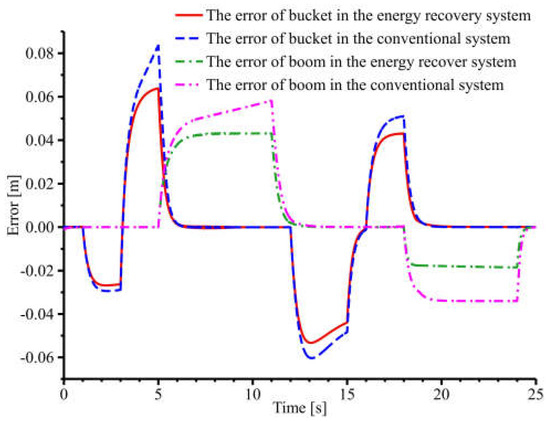 As shown in Figure 16, after the first working cycle, the boom and bucket cylinders of the conventional and energy recovery systems can carry out compound actions due to the pre-valve pressure compensation technology and the cylinder position control systems. Both the boom and bucket cylinders can track the target displacements. As shown in Figure 17, the displacement error of the energy recovery system is smaller than that of the conventional system when the target displacement of the boom cylinder changes. The same is true when the target displacement of the bucket cylinder changes. Then, the transient performance of the energy recovery system is better. The displacement error of both the energy recovery system and the conventional system is 0 when the target displacement of the boom bucket and cylinder is constant. Then, both the energy recovery and conventional systems have better steady-state performance. In summary, the energy recovery system’s transient performance is better than the conventional system.