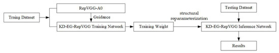 The KD-EG-RepVGG surface defect detection algorithm is designed using structural reparameterization, GELU, ECA networks and knowledge distillation for the task requirement of surface defects identification. Through experimental comparative analysis, the KD-EG-RepVGG network is characterized by a low number of parameters, low computational effort, high speed and high accuracy. The general idea of the method in the paper is illustrated in Figure 1. The teacher network RepVGG-A0 guides the KD-EG-RepVGG network training. The structural re-parameterization technique loads the training weights into the KD-EG-RepVGG inference network to finally obtain the prediction results.