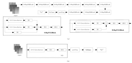 The EG-RepVGG network is based on structural reparameterization, incorporating a lightweight attention network while using GELU as the activation function in the improved network, stacking the S-RepVGG block module and D-RepVGG block module based on RepVGGBlock. The model is structured as shown in Figure 2. The main function of the D-RepVGG block module is to extract features and adjust the space size and channel number of the feature map, whereas the main purpose of the S-RepVGG block is feature extraction. The S-RepVGG block has an additional directly connected structure compared to the D-RepVGG block, which mimics the residual connection in ResNet [14] and improves the model’s ability to extract features. The output of D-RepVGG Block5 is made up of global average pooling and then a softmax classifier is appended. The global average pooling layer is used to downsample the output spatial resolution of the feature map to 1 × 1. The softmax layer is used to output the predicted categories. They together form the classification layer. With the aim of further improving the accuracy and generalization performance of the model, the RepVGG-A0 as a teacher model is used to guide the training of EG RepVGG model using knowledge distillation technology. The final result is a lightweight, fast and highly accurate strip steel surface defect recognition model, the KD-EG RepVGG model. The detailed structural information of the KD-EG-RepVGG model is shown in Table 1.