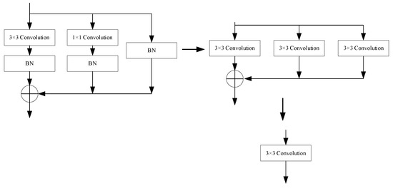 The structure of the network under training is illustrated in Figure 3a. In the training phase, the RepVGG Block consists mainly of 3 × 3 convolutional kernels, 1 × 1 convolutional kernels and Identity branches. By adding Identities branches and 1 × 1 convolutional branches in parallel, information at different scales of the image can be extracted and fused, increasing the representational power of the model.