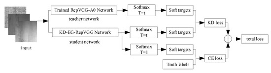 The activation operation will establish a stochastic connection between the input and output, effectively avoiding the situation where the neurons are set to zero and enhancing the learning speed and stability of the network. The hyperparameter softens the output categories of the large and small networks to find the distillation loss of the two networks’ outputs and the direct training output loss of the small network. The two losses are weighted and summed to obtain the training losses of the networks. The entire knowledge distillation network training process is shown in Figure 6. In this paper, the KD-EG-RepVGG network was obtained by using RepVGG-A0 as the teacher network and instructing the training of the EG-RepVGG network.