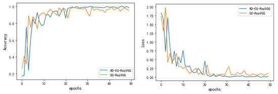 The comparison revealed that the lightweight model KD-EG-RepVGG after knowledge distillation had an accuracy improvement of greater than two percentage points over the EG-RepVGG model. Furthermore, the accuracy of the lightweight KD-EG-RepVGG network after knowledge distillation was improved by 0.6 percentage points over the teacher network RepVGG-A0. The Matthew’s correlation coefficient of KD-EG-RepVGG on the test set is 99.02%, which further proves that the model is very accurate in identifying the surface defects of the strip. Figure 8 shows the validation accuracy and loss curve of the network. From the curve change trend, we can find that the KD-EG-RepVGG network converges faster and the model accuracy is higher. The aim of transferring the knowledge of large models to small networks and improving the accuracy and generalizability of the networks is achieved.