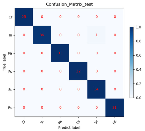 Furthermore, to analyze more clearly the capabilities of the model, we calculated the confusion matrix of the model on the test set and the results are shown in Figure 9. From the confusion matrix, it can be obtained that the model had a high recognition rate of defects. The recall rate was calculated according to the confusion matrix, and it was found that only the “In” defect was 97.30%, and the other defects were 100%. The precision was calculated, and it was found that only the “Sc” defect is 97.13%, and the other defects were 100%.