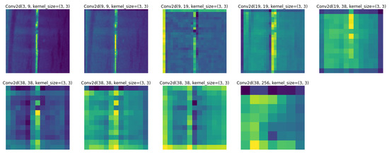 The features of the middle layer of the convolutional neural network model are visualized in order to gain a clearer understanding of the features learned with the convolutional neural network [21]. A random selection of defective images is fed into the KD-EG-RepVGG inference network, which visualizes the convolutional layers in the network. The visualization results are shown in Figure 10. In the KD-EG-RepVGG network, the shallow convolutional network retains the image information relatively intact, with the main detection being contour information. The deeper convolutional layers focus more on the location features of the target and some abstract information. From the visualization results, it can be observed that important regional features in the image are encoded into the network, indicating that the network is effective for feature learning.