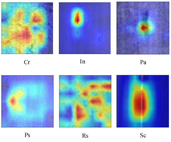The Gradient Weighted Class Activation Mapping algorithm [22] (Grad-CAM) is used to fully demonstrate the ability of the KD-EG-RepVGG network to extract defective features. A heat map was used to show the activated regions in the images, which is more consistent with human vision properties. This is more in line with human visual properties. The final layer of the KD-EG-RepVGG network was chosen for visual representation in this paper. This is because it is a generalized representation of the feature extraction from the previous layer of the network. Images of six types of defects were randomly selected for visualization with darker colors indicating that the network is paying more attention to the point. This is shown in Figure 11.