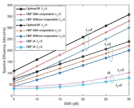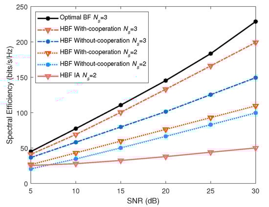 In this section, we compare the performance of the proposed hybrid beamforming designs in the with-cooperation scenario (HBF with cooperation) and the without-cooperation scenario (HBF without cooperation) to the optimal beamforming (optimal BF) designs and interference alignment (IA)-based hybrid beamforming (HBF IA) schemes under different cellular cooperation and data transmission scenarios. The benchmark is the performance of the optimal beamforming designs in which streams are sent along the channel’s dominant eigenmodes. Figure 3 shows the spectral efficiencies of the proposed hybrid beamforming algorithms and other hybrid beamforming schemes under different effective transmit SNRs. The number of RF chains is set as 6 for the MBS and 3 for PBSs, with the number of data streams set as = 2 or 3. The spectral efficiencies of the proposed MMSE-based hybrid beamforming schemes are essentially close to those achieved by the optimal beamforming solution in the case of , as shown in Figure 3. The achievable sum rate of the HBF with-cooperation algorithms is higher than those of the HBF without-cooperation algorithms and IA-based hybrid beamforming algorithms. The performance gap among the proposed MMSE-based HBF with-cooperation, HBF without-cooperation, and IA-based hybrid beamforming algorithms increase with the increasing SNR. It turns out that compared to the IA-based or MMSE-based without-cooperation algorithms, the proposed MMSE-based with-cooperation algorithms are more able to reduce interference. As a result, in the with-cooperation scenario, the entire HetNet transforms into a big single-user MIMO system and inter-cell interference no longer exists; only inter-data-stream interference has to be addressed. When comparing the results of the proposed MMSE-based hybrid beamforming algorithms to those of the optimal beamforming framework and IA-based hybrid beamforming schemes with different data transmission scenarios, the larger data stream schemes yield a better achievable sum rate. Because of the larger data stream transmission schemes leveraging the additional degrees of freedom offered by the MIMO mmWave HetNet, the proposed MMSE-based with-cooperation algorithms yield a better achievable sum rate than the MMSE-based without-cooperation algorithms and IA-based hybrid beamforming schemes.