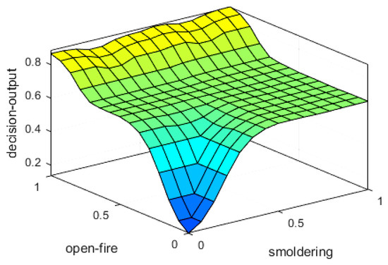 The occurrence of fire can be clearly judged from the output surface of fuzzy inference. The x axis is the probability of open fire, the y axis is the probability of smoldering fire, the z axis is the decision output value u, and the fluctuation of color represents the early warning situation. The dark blue situation is relatively light, and the yellow situation is serious. Specifically, when u < 0.25, it is normal, 0.25 ≤ u < 0.5, it is abnormal, 0.5 ≤ u < 0.75, it is critical alarm, and u ≥ 0.75, it is extremely urgent alarm.