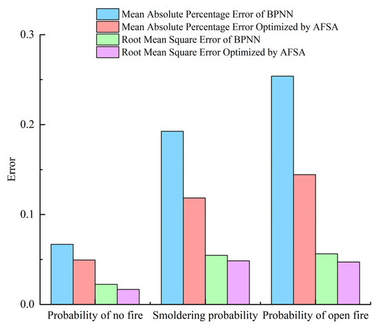 Error of BPNN and AFSA-BPNN algorithms in predicting fire probability.