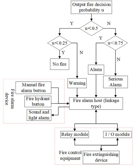 Based on the decision-making judgment of the predicted sample fire probability value, the fire alarm host interacts with the fire control equipment to take corresponding fire control measures. When the output decision is no fire, the substation operates safely; when the decision is warning, the fire extinguishing device is not started, and the substation personnel always observe the abnormal signal, and check the warning place if necessary; when the decision is to alarm, the fire alarm host receives the signal to start the automatic fire extinguishing device immediately; when the decision is serious alarm, the automatic fire extinguishing device is started immediately, the power supply is cut off, and the substation personnel go to the alarm to handle the accident. The fire control system is shown in Figure 7. The black arrow indicates the direction of information interaction.