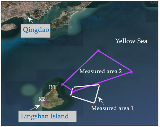 Based on the S-band radar sea clutter data measured by the China Radio Propagation Research Institute on Lingshan Island in the Yellow Sea, this study analyzes the factors influencing sea spikes. Figure 1 shows the installation location of the radar on Lingshan Island and measured areas of the sea surface. The S-band radar is a shore-based radar with a pulse Doppler system, HH polarization, and range resolution of 60 m. The experiments were conducted between October 2013 and September 2014. In 2013, the altitude of the radar was approximately 70 m, the azimuth was fixed at 110°, the main beam of the radar antenna was pitching down by 0.5°, and the range of the grazing angle was 0.7°–1.7°, corresponding to the radial distance from 2.3 km to 5.7 km, marked by white lines in Figure 1. In 2014, the radar was erected at an altitude of approximately 430 m. The main beam of the radar antenna was pitching down by 5°, the azimuth was fixed at 65°, and the grazing angle was 2.6°–7.1°, corresponding to the radial distance from 3.5 km to 9.5 km, marked by pink lines in Figure 1.