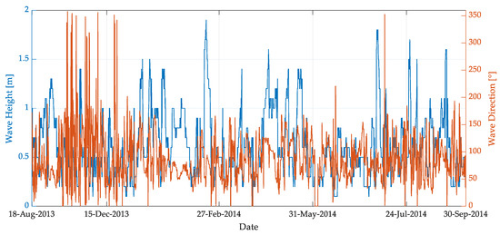 As shown in Table 1, 2317 sets of sea clutter data were obtained during the experiment, including 466 sets of data collected in 2013 and 1851 sets of data collected in 2014. The wave height ranges from 0.1 m to 2.0 m, and the relative wave direction includes up-wave, cross-wave and oblique-cross wave, according to the relative angles between the radar beam direction and swell direction of sea. The wind speed ranges from 0.1 m/s to 14 m/s. Figure 3 shows the variation in oceanic parameters with dates.
