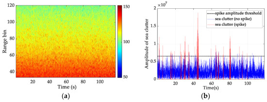 According to the above conditions, the sea spike can be separated from the clutter background. It should be noted that these three parameters may differ in different radars and environments. The parameters adopted in this study were as follows: the minimum spike width was 100 ms, the minimum spike interval was 500 ms, and the spike threshold was five times the average power of sea clutter, i.e., . Figure 4a shows the range-time image of a group of sea clutter data, and Figure 4b shows the sea spikes’ discrimination results at 80th rang bin in Figure 4a. The red line represents the clutter data identified as sea spikes, the blue line represents the sea clutter background data, and the black dotted line represents the set spike amplitude threshold.