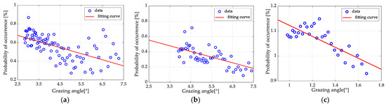According to the Formulas (3)–(5), we have obtained sea spikes’ probability at every range gate for all datasets. Figure 5 shows the variation trend of the sea spikes’ probability with the grazing angle in the three groups of data at different grazing angle ranges. Figure 5a,b presents datasets in 2014, and the grazing angle ranges are 2.6° to 7.5° and 3.7° to 7.5° separately. Figure 5c is a dataset in 2013 with grazing angle from 1° to 1.7°. As shown in Figure 5, the probability of sea spikes increases gradually with a decrease in grazing angle. This result implies that phenomenon of sea spikes is more likely to occur at smaller grazing angles, which is consistent with conclusions in the literature [16,17,23]. At the same time, we perform curve fitting for these three groups of data and find that they almost show a linear trend of change at their ranges of grazing angle.