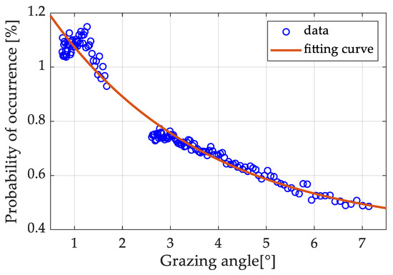 Furthermore, through regression fitting of the data, it was found that the probability of a sea spike increases exponentially with grazing angle decreasing at the range from 0.7° to 7.1°, and the fitting formula is as follows: