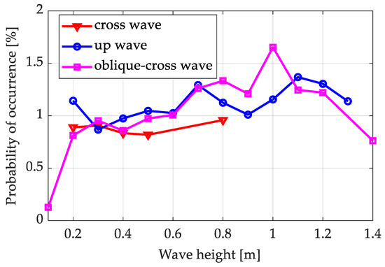 It should be noted that in Figure 7, there is some relationship between wave heights and the probability of sea spikes. In the up wave direction, the probability value of sea spikes increases slowly with the wave height. However, in the oblique-cross wave direction, the probability increases from 0.1 m to 1 m and decreases from 1 m to 1.4 m, and especially for wave heights approaching 1 m, it is significantly higher with a steeper rate of change.