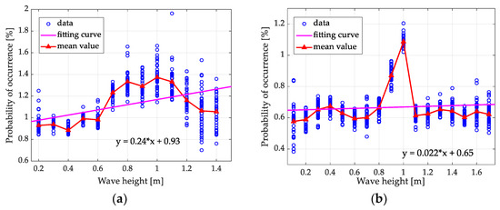 As shown in Figure 8a, the dynamic range of probability value at each wave height is among 0.2% to 0.8%, which is hard to summarize the variation rules. However, when observing the average values at each wave height, the probability increases from 0.2 m to 1 m and decreases from 1 m to 1.4 m. For the linear fitting curve, it shows that the probability of sea spikes at 0.8° grazing angle gradually increased with increasing wave height, and the slope of the linear is 0.24. In contrast, in Figure 8b, there is no obvious trend with wave heights increasing for the data at 5.1° grazing angle. If not the probability values at 0.9 m and 1 m are much bigger than the other wave heights, it can almost be considered that the wave height has no influence on the probability value.
