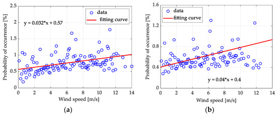 It can be seen that with an increase in the wind speed, the probability of a sea spike gradually increases. We performed curve fitting for the two datasets and found that they almost show a linear trend of change with wind speed. The linear fitting formulas are as follows: