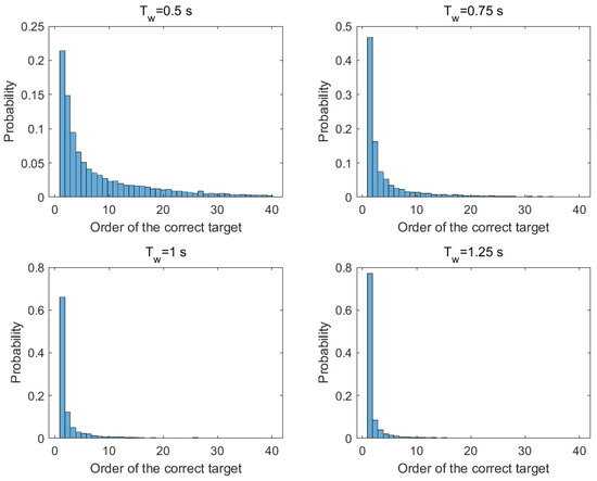 Let denote the probability that the training data pool contains the required data. Along with the user’s continuous input of characters, the training data pool is continuously expanding [26]. Therefore, the value of increases with use time until it reaches one; the data pool contains at least one experiment of each candidate’s goal and forms a complete dataset. Before the data pool collects at least one complete training set, the value of N is another factor affecting . When , without complete training datasets. When (the minimum value), is at its maximum value under the same data pool. In addition to , the value also has a certain influence on the performance of the second-stage detector. It is not easy to only qualitatively analyze the effect of the value of N on the performance of the detector. Namely, the value of N is approximately positively correlated with the second-stage detector’s performance.