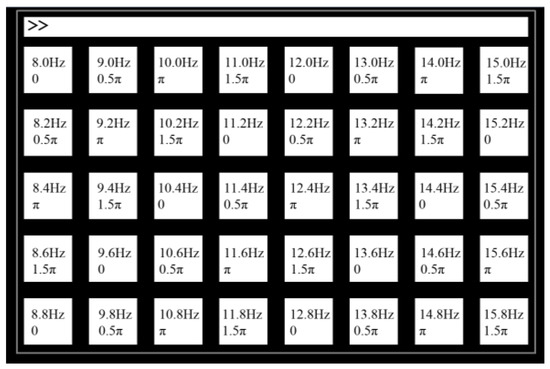 The benchmark dataset is recorded in the SSVEP speller experiment with 35 subjects. Each experiment contains 6 blocks. During the block, the subject is shown a matrix () of 40 target characters on the screen flickering at various frequencies (range from 8 to 15.8 Hz with an interval of 0.2 Hz) with at least 0.5 phase difference between adjacent frequencies. The stimulation is shown in Figure 3. The details of the datasets can be found in [2]. According to [24], nine electrodes (Oz, O1, O2, Pz, POz, PO3, PO4, PO5, PO6) worth of data are selected to identify the targets. Considering a latency delay in the visual pathway, the data epochs are extracted in [, ], where stands for the data length, and time 0 is the stimulus onset.