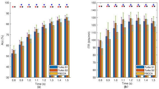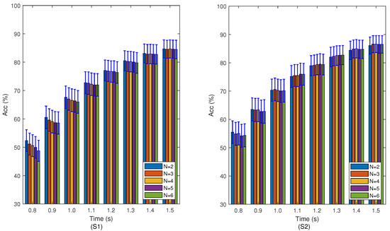 Figure 4 shows the average classification accuracy of all subjects in the benchmark dataset corresponding to different data lengths (from 0.8 to 1.5 s with an interval of 0.1 s) and different values of N (from 2 to 6). Figure 4(S1) demonstrates the certain roles of values of N on the performance when the data length is short. In addition, when the data length reaches 1 s, the value of N has a minor effect on the performance of the turbo detector; its performance gradually dips with the increase in the value of N when the data length is less than 1 s. This is because, with the increase in N, the mislabeled data in the training data also rises correspondingly, while the performance of the detector increases less, according to Equation (8). The paired t-test also reveals the significant difference between the average accuracy of the turbo detector with a different N value when the data length is less than 1.1 s. As shown in Table 1, when s, there is a significant difference () between the accuracy of the turbo detector with different values of N. Instead, when s, there is a significant difference () between the accuracy of the turbo detector with adjacent values of N; that is, only between and . Figure 4(S2) illustrates the performance of the detector when it has adopted the S2 data selection strategy. The results show the negligible role of the value of N on the detector performance. As shown in Table 1, the paired t-test also indicates that conclusion.