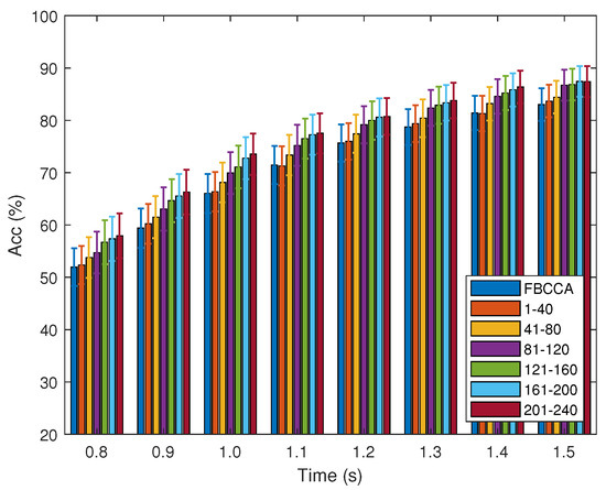 To overcome the effects of non-Gaussian background noise and the SSVEP harmonies, FBCCA decomposes the EEG into several sub-bands and employs standard CCA to process the sub-band data. In this paper, the lower and upper cut-off frequencies of the m-th sub-band are set to Hz and 90 Hz, respectively. Both the number of sub-bands and the harmonic number of the reference signals () are set as 5. Then, using the weighted correlation coefficient in (3) and (4), a weighted sum of squares of the correlation coefficients of all sub-bands can be expressed as: