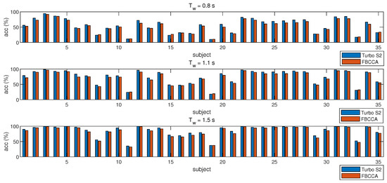 Given that the training data in the second-stage detector are labeled by previous identification, the error-labeled training data in the data pool will definitely influence the subsequent target identification. Figure 7 shows the classification accuracy of all subjects with a data length of 0.8, 1.1 and 1.5 s, which demonstrates the higher average accuracy of subjects whose performance was improved compared with those that deteriorated. Table 3 also proves the much higher average accuracy of improved subjects than that of the deteriorated subjects. Such a phenomenon can be explained by the influence of data wrongly labeled by the detector among the training data pool on the performance of the turbo detector. Despite the above, the turbo detector still outperforms the FBCCA detector. Figure 7 and Table 2 reveal the extremely low accuracy of the deteriorated subjects detected by FBCCA. Instead, the identification accuracy of the turbo detector for the deteriorated subjects only dips a bit (e.g., s, the accuracy loss is 1.4%). Furthermore, as the data length increases, the accuracy of the training data labels decreases the impact of wrong labels (e.g., s, no subject’s accuracy decreases).