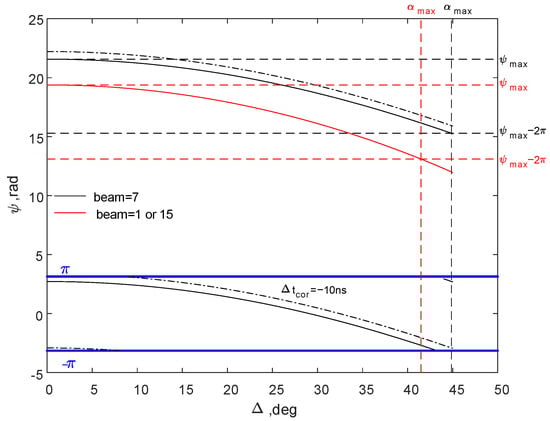 In addition, the frequency range of the high-frequency radar in the Zhongshan radar is 8–20 MHz [23]. According to the wavelength formula λ = c / f , the distance between the two arrays is greater than the wavelength λ of the transmitted signal (~15–37.5 m). As the measured phase difference is restricted to be between π and π , there is a potential ambiguity between the measured ( Ψ ) and the actual phase difference [2,15]. This can be seen as the black solid curve and the dashed curve in Figure 2 with Δ t c o r = 10 ns . Therefore, the ideal phase difference and the measured phase difference can be rewritten as
