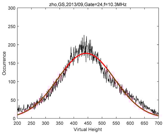 Figure 3. The virtual height distribution of ground backscatter echoes for range gate 24 (1215–1260 km) at the Zhongshan radar in September 2013. The black line represents the actual virtual height calculated by the elevation angle and group range, and the red line represents the result of fitting with a Gaussian function.