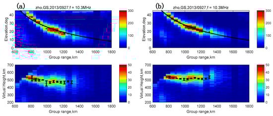 Figure 4. The distribution of the elevation angle (top) and virtual height (bottom) of all beams of the ground backscatter echoes from the Zhongshan radar on 27 September 2013, where the radar frequency is 10.3 MHz. (a) The original (uncalibrated) data; (b) data calibrated with Δ t c o r = 6 n s . Black dots and lines at the top correspond to peak elevation of each gate and fitting curve. Error bars at the bottom show the actual and fitting deviations.
