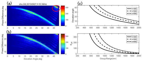 Figure 5. The same data as Figure 4, (a) the measured data and (b) the elevation–phase difference change with ambiguity factor added. (c) theoretical group range–elevation and group range–phase offset trends at h = 400, 500, and 600 km. The red circle in panel (a) shows ambiguity in the phase difference measurement.