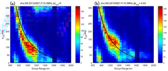 Figure 6. Number of echoes between the phase deviation and the group range from Zhongshan radar on 27 September 2013. The solid black line represents the theoretical relationship between the phase deviation and the group range when the virtual height is 520 km. (a) the original (uncalibrated) data; (b) data calibrated with Δ t c o r = 5.93   ns .