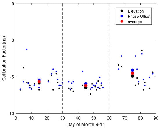 The data shown in Figure 6 show that the calibration factor Δ t c o r obtained by the phase offset verification is consistent with the elevation–virtual height model. Figure 7 shows the comparison of Δ t c o r determined by the two algorithms from September to November 2013. The black and blue dots are the daily calibration factors obtained by using the elevation angle and the phase offset, respectively. The black and blue solid circles correspond to the monthly mean calibration factors obtained by the daily calibration factors. There are some days with no data, which results in there being not enough ground echoes to calibrate. Δ t c o r is mostly concentrated between −5 and −7 ns, and the estimated values of the difference of two algorithms are generally less than 1 ns. The red solid circle is the mean value of the two methods, which is −5.68 ns, −6.24 ns, and −4.54 ns from September to November, respectively.