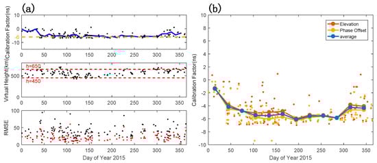 Figure 9. (a) The estimated calibration factor (top), mean virtual height (middle), and RMSE comparison before and after calibration (bottom), from the Zhongshan radar in 2015. The yellow dotted line on the top panel represents a calibration factor of −6 ns and the blue line represents the mean value from 10 days. The red dotted line in the middle panel represents a virtual height of 450 km and 650 km. (b) Statistical distribution of the calibration factors for the two methods in 2015, elevation angle (red), phase offset (yellow), and average of two (blue). Dots represent daily distributions, filled circles represent monthly distributions, and line graphs represent monthly averages calculated from the daily estimates.