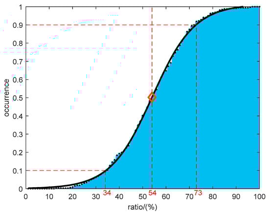 Figure 10 shows the statistical distribution histogram of RMSE before and after calibration for 2013–2015. We calculated the distribution of the RMSE ratio before and after calibration, presenting a probability histogram for each ratio, and used the Logistic algorithm to fit. The results show that the ratio is concentrated between 34% and 73%. The maximum slope represents the peak value of the ratio occurrence. The RMSE of the group range–elevation distribution is mostly reduced to within 54%.