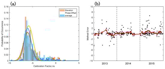 Figure 11. (a) The elevation angle (Red), the measured phase offset (yellow), and the average of two algorithms (blue) used to obtain the statistical distribution of the calibration factor. Curve represents the result of Gaussian fitting. (b) Two algorithm calibration factor error, black and red dots represent the daily and monthly average changes, respectively.