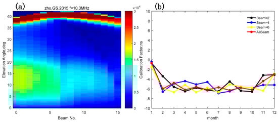 When the Zhongshan radar receives the echoes returned from all directions, it will be equally divided into 16 fan-shaped echo receiving areas in the sweep mode. Figure 12 shows the elevation distribution measured by each beam at the Zhongshan radar for one month. From the Figure 12a, there is a high elevation angle curve band, which is the result of the aliased elevation measurements [14]. For the Zhongshan radar, the number of echoes varies with the beams. Overall, the most elevation angle information is from the beams with small numbers, with an obvious broadband from 5° to 20°, this is due to the coverage for different beams. Although the method discussed above uses data for all beams, we also considered that the values of the calibration factors may change with the beams. Figure 12b shows the change in Δ t c o r over one year based on monthly statistics for beam 2, 4, 6, and all, respectively. The change in Δ t c o r is smoother than that of the diurnal variation (not shown). The value of Δ t c o r shows the same variation through the year of the diurnal variation, and its value fluctuates around −6 ns and does not change with the beam significantly, except in January, which is consistent with Figure 8b.