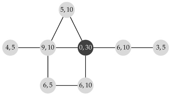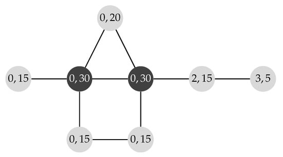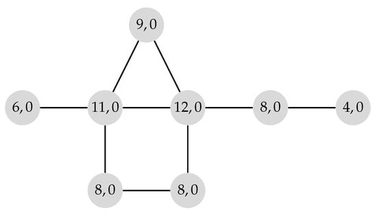 We illustrate the performing of the Minimal_12_Set for and . Let G be a graph as in Figure 2. The first number inside a node is its power, while the second–code. The numbers in Figure 2 show their values after performing the first five lines of the Algorithm 2.