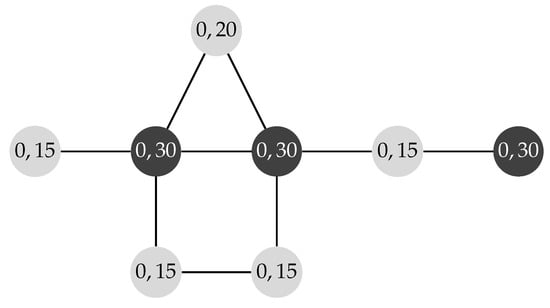 The graph G after the last, third performance of the main loop is shown in Figure 5. The power of each node is 0. Since , in this example the Minimal_12_Set algorithm finds a minimal -dominating set with the minimum possible cardinality.
