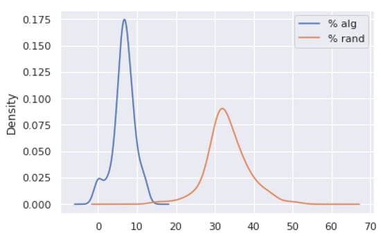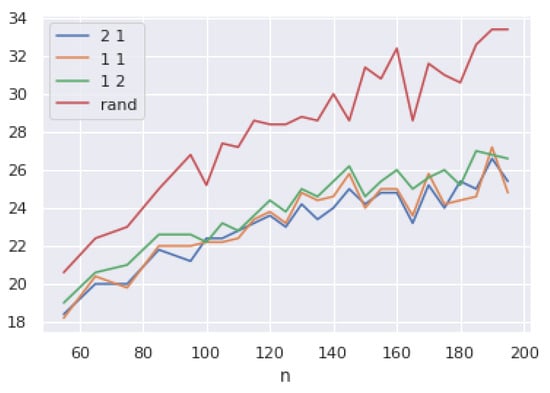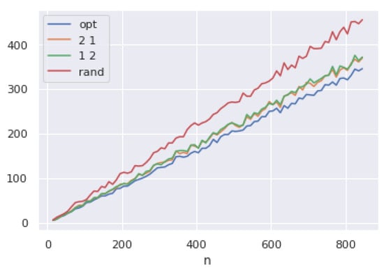 It can be seen that the differences between the values returned by the Minimal_12_Set algorithm and the exact algorithm were much smaller than for the case of random algorithm. To investigate this difference more deeply, we counted the percent error. Namely, Figure 8 shows the percent error of the minimum value returned by algorithms 2 1 and 1 2 in relation to the optimal solution (denoted % alg), as well as the percent error of the random algorithm (denoted % rand). We noted that the Minimal_12_Set algorithm gives much better results than the random one.