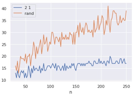 We have tested the algorithm for random graphs generated according to the Erdos–Renyi model for n varying from 30 to 250 and the probability for constructing a link . The results can be seen in Figure 9.