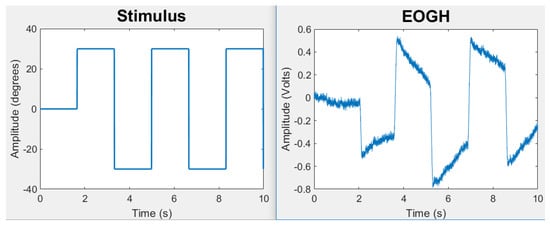 A simple saccadic (SSAC) stimulus is a type of visual stimulation where a point (in our case, a lit LED) appears in a position on the screen and stays illuminated for a certain time. It then disappears and appears in another position by activating another LED on the same horizontal axis. To follow the point with the gaze, the patient must perform a saccadic movement in order to focus on the new position of the point each time it changes. Figure 2 shows an example of a stimulus and the corresponding EOG response acquired in the horizontal lead (EOGH) for a healthy patient.