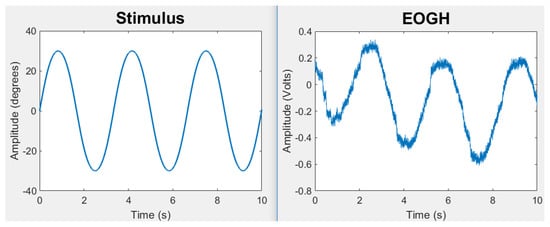 Smooth pursuits are a different type of visual stimuli. The stimulus on these tests moves on the horizontal axis describing a linear (Smooth Pursuit with Constant Speed, SPCS) or sinusoidal (Smooth Pursuit with Sinusoidal Speed, SPSS) law, causing the patient to follow it through slow movements of their eyes. An example of a SPSS signal corresponding to the stimulus (left) and the EOGH response of a healthy patient (right) are shown in Figure 3.