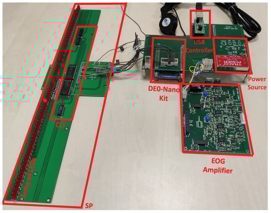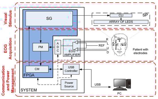 Although the system used external components such as the SP, the core of the proposed system is implemented on the FPGA. The components allocated on the FPGA are the SG, the PM, and the CM, which belong to the Visual Stimulus, the EOG Acquisition, and the Communication stages, respectively.