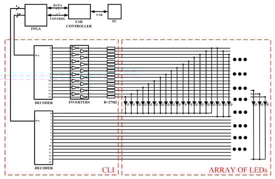 The use of the CLI inserted on the SP has the advantage of wire simplicity. Only 8 wires from the FPGA to the SP are needed for addressing the LEDs. As a result, the system is less bulky and allows the use of low-end FPGAs offering a low number of general-purpose inputs/outputs (GPIO).