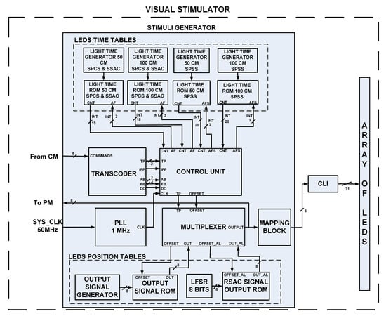 Figure 8 details the blocks outline of the stimulator. The SG includes: (a) a transcoder that identifies and separates the bytes with the information of the stimulus, (b) a Phase Locked Loop (PLL) that generates a clock signal of 1 MHz for the internal blocks, (c) six Read-Only Memories (ROM), four containing the lighting time values of each LED, where the fifth stores the random saccadic test amplitudes, and the last one, the amplitudes of the other tests, (d) six signal generators to fill the ROM, (e) a control unit for managing the process of visual stimulation, and (f) a multiplexer that selects the stimulator output depending on a logic that considers the characteristics of the test to perform.