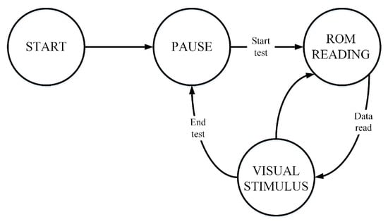 In the START state, the system initializes by generating and storing in the internal FPGA memory (ROMs) the tables with LED lighting times and their positions in the SP. Then, the SG passes to the PAUSE state. It will only leave this state when it receives from the PC the characteristics of a test (amplitude, frequency, distance and type of stimulus) along with the command to initiate a test. In that case, the SG automatically reads from the ROMs the initial LED lighting time and its position in the SP (ROM READING state). Then in the VISUAL STIMULUS state, the LED position to the array of LEDs is sent through the CLI. The time the LED will be lit is the LED lighting time read in the previous state. When this time is consumed, the system returns to the ROM READING state. It will alternate between this state and VISUAL STIMULUS until it receives the command for ending the test, and then it passes to the PAUSE state.