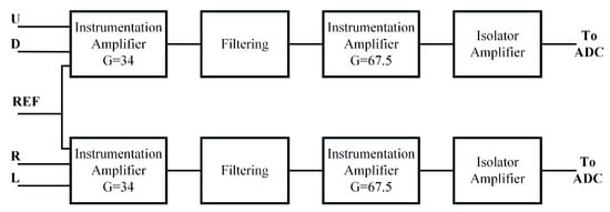 - Low Cost, Low Power Instrumentation Amplifier. AD620 Analog Devices. Available online: https://www.analog.com/media/en/technical-documentation/data-sheets/AD620.pdf (accessed on 14 December 2021).