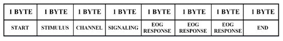 Multiple electrodes are placed in the face of the patient in order to capture the EOG signal, as depicted in Figure 6. The medical staff working in the desktop PC sends, through USB communication, a data transfer with the characteristics of the tests. A USB controller manages the communication between the desktop PC and the CM block on the FPGA, which receives the data from the PC and sends it through four 8-bit frames or commands to the SG. Based on the command received, the SG obtains the information related to the LED’s lighting time and the position in the array of the active LED. An output signal corresponding to the position of a specific LED in the array is generated to activate the LED. The same output signal, which constitutes the stimulus, is sent to the PM, also responsible for building an 8-byte multi-frame with the stimulus and EOG signal from the patient and sending it to the PC. Both signals, stimulus and response, are sent in the same frame, which grants a real-time response.