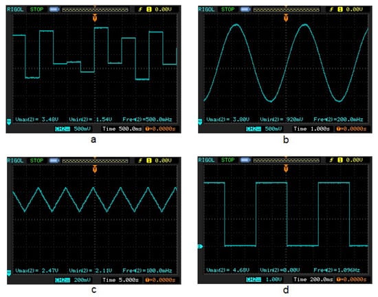 Generated signals viewed on a RIGOL oscilloscope. (a) RSAC, (b) SPSS, (c) SPCS, (d) SSAC.