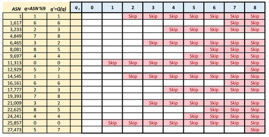 Disturbance levels for all channels, defined by the set , are finally fed as input to a shaper block. Let c be the channel used by TSCH for transmitting in the current slot (in every slot, at most one link is enabled for transmission on any given mote). The purpose of the shaper is to selectively skip part of the cells by choking every channel of the considered link to a fraction of the whole capacity based on its quality. To this extent, an integer quantity q is defined in the shaper, evaluated as . It is important that , , and are prime numbers. This means that, by considering any consecutive cells of the same link whose transmission is set to happen on channel c, all of them are characterized by different q values. Moreover, the related sequence of q values repeats itself every such cells, i.e., every slots. In a real implementation, a bijective function Q should be additionally applied, that is, , so that the values seemingly hop in a truly random way across all the values in the range .